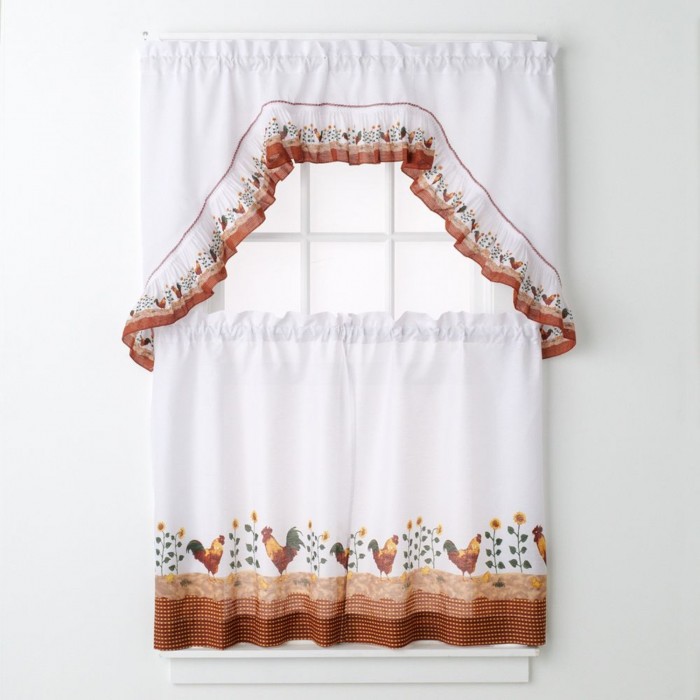 Cheer up your kitchen with this Rooster Curtain Set. The ruffle tier curtain features rooster, sunflower and chick graphics and a checkered trim. Made of durable poly cotton blend for lasting quality. Standard rod pockets allow for easy installation. Machine washable for easy care.- Three piece set includes two tiers and one swag valance