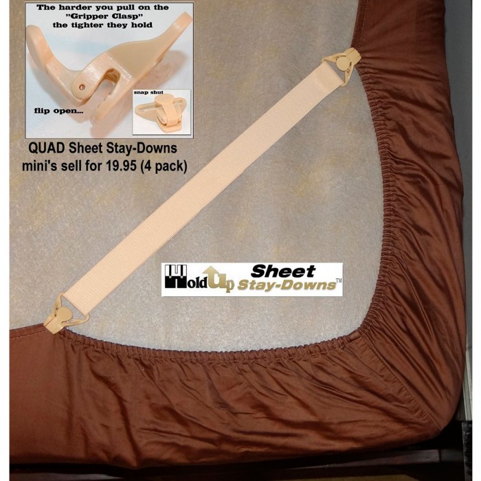 The Short Quad Style fits diagonally across each corner under the mattress. Features the patented composite plastic, cam-activated non-slip gripper clasp (the harder you pull, the tighter it holds) as well as our unique velcro type tension adjusting system. No matter how much you toss or turn, Sheet Stay-Downs will keep your bedsheets taut and firmly in place!