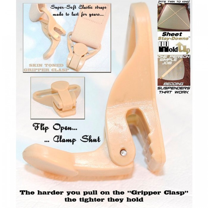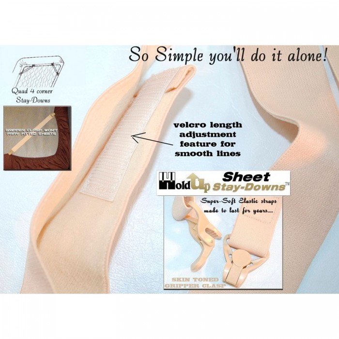 Unlike any other sheet stay ever sold, this Sheet Stay-Downs have patented no-slip gripper clasps along with patent pending velcro type adjusters, to create the most functional sheet stay on the market.