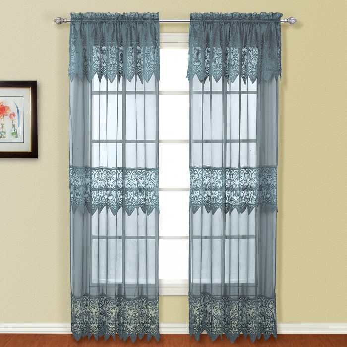 The Valerie curtain features sheer panels with gorgeous macrame insets on the valance, in the mid section of the panels and at the border. The macrame lace is scalloped for an added touch. The attached valance makes installation a breeze. Curtains are made of 100% polyester. Machine washable. Imported.- Voile panel with horizontal macrame, with attached valance